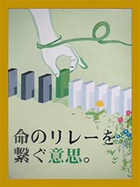 講評:命のリレーをドミノ倒しに例え、途切れないための緑の牌を臓器提供の意思としてグリーンリボンを巻いた手が優しく置いています。