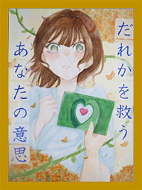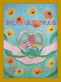 講評:提供臓器の代表として心臓が象徴的に扱われる作品が多い中、全ての提供可能臓器に目を向け、最大11人に提供可能という数字を示したのは他にない視点でした。11輪の花が咲いています。 |