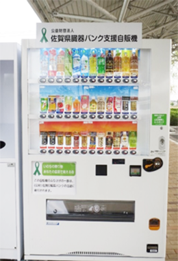 佐賀県臓器バンクでは、臓器移植及び腎臓病の予防に関する理解を広げるための県民への広報とともに、いつでも・だれでも・気軽に寄付していただけることを目的に「佐賀県臓器バンク支援型自動販売機の設置促進に取り組んでおります。